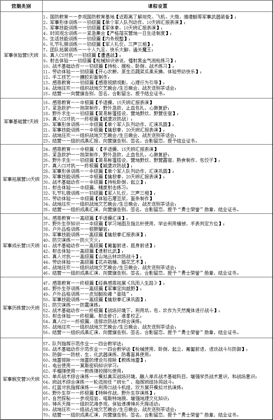 着装:为学员定制“骁战勇士”特制迷彩服装一套,体能训练服一套,含帽子,腰带,水壶(军用)。