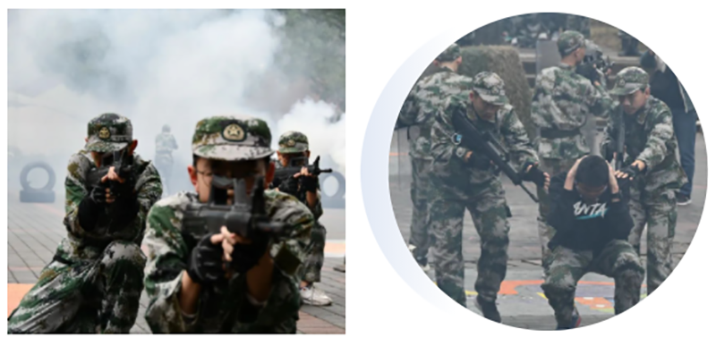 狼烟起,战火硝烟弥漫,整个训练场就如真正的战场,各种交替掩护战术动作,高姿,低姿,侧姿匍匐动作,防控预警,穿越火墙等等动作深深地吸引了大家的眼球。