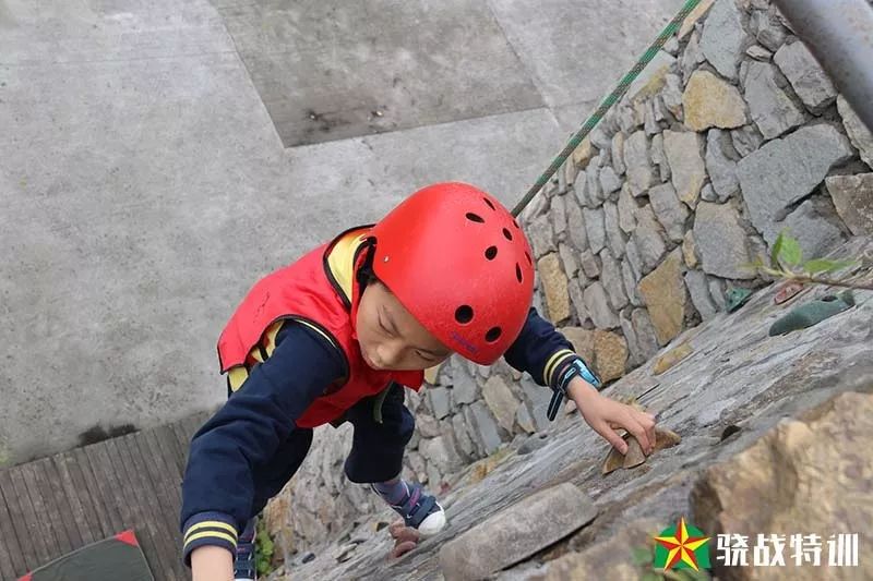 登高远眺砺练出超越平凡的勇气,同学,不要怕,双手抓紧岩壁,用力攀登,目标,顶端钢索,向上,再向上!